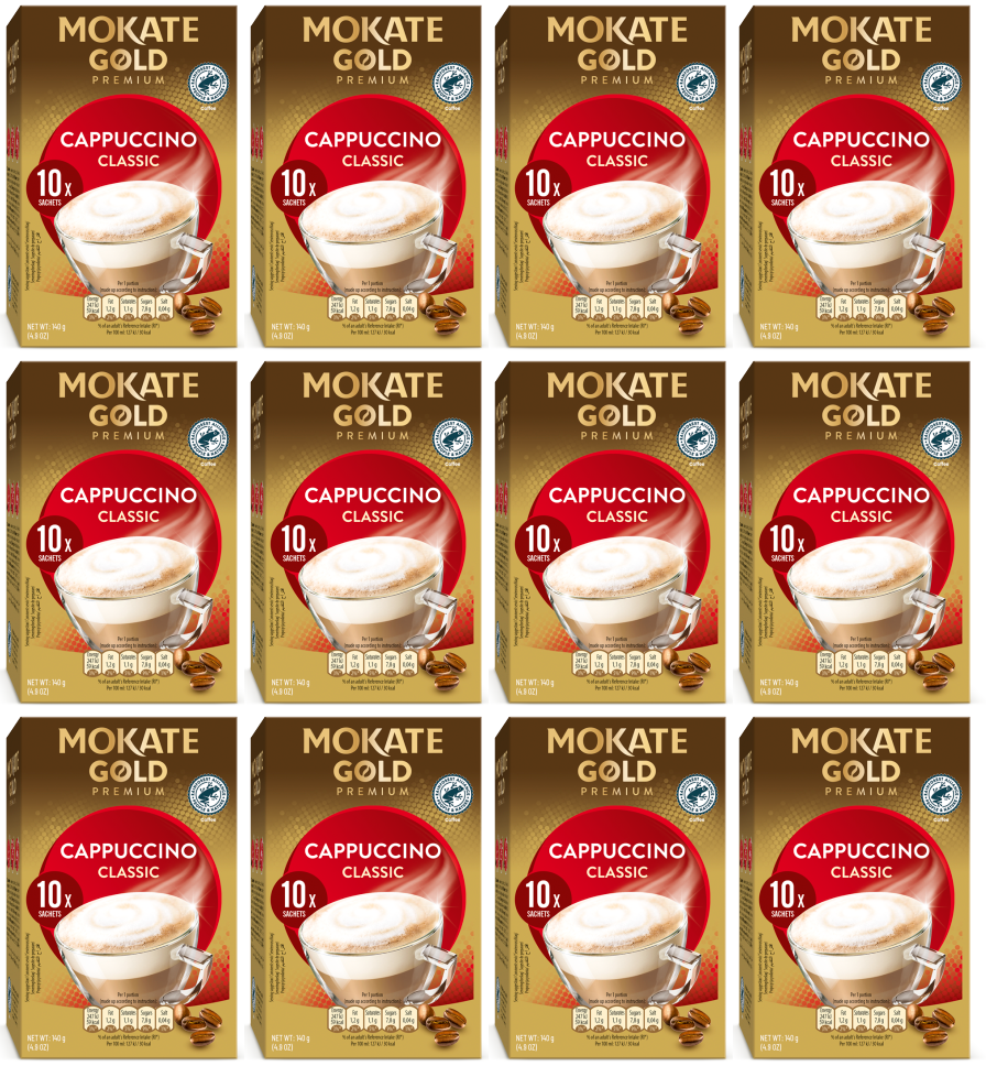 12 x Mokate Gold Prem Cappuccino Unswt 10 Sachets - 140GM