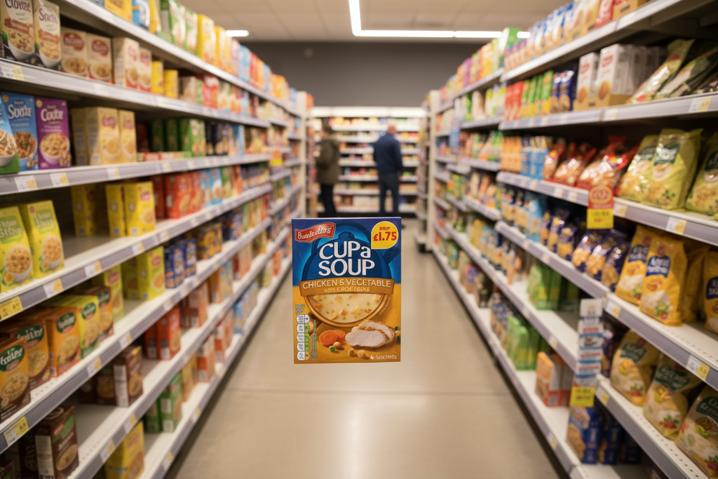 Water, Glucose Syrup, Vegetables (3.5%) (Carrot, Onion, Peas), Maize Starch, Potato Starch, Cooked Chicken (1%), Palm Oil, Croutons (0.5%) (Wheat Flour (with added Calcium, Iron, Niacin, Thiamin), Palm Oil, Salt, Yeast, Antioxidant (Rosemary Extracts)), Salt, Parsley, Flavourings, Potassium Chloride, Garlic, Milk Proteins, Yeast Extract (contains Barley), Sugar, Emulsifiers (Citric Acid Esters of Mono- and Diglycerides of Fatty Acids, Mono- and Diglycerides of Fatty Acids), Ground Turmeric, Black Pepper Extract.